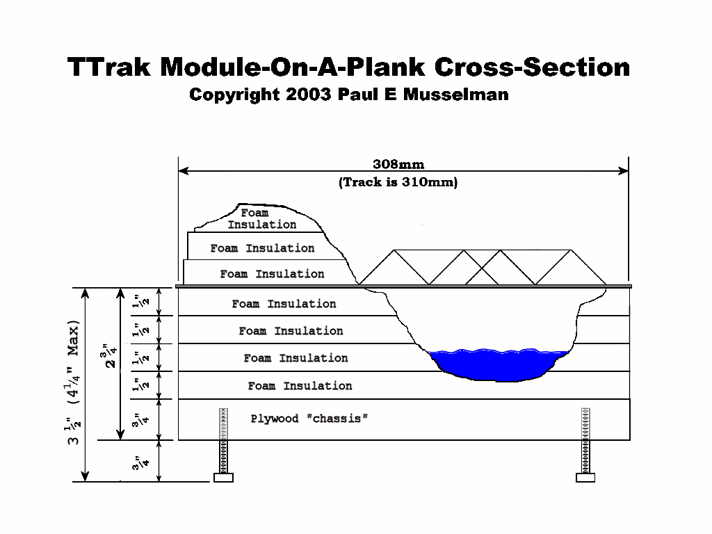 If you've built to 'official' dimensions, the plywood + foam is 2-3/4" tall. This gives you 2" below track level for additional scenery (gullies, valleys, rivers, etc.).